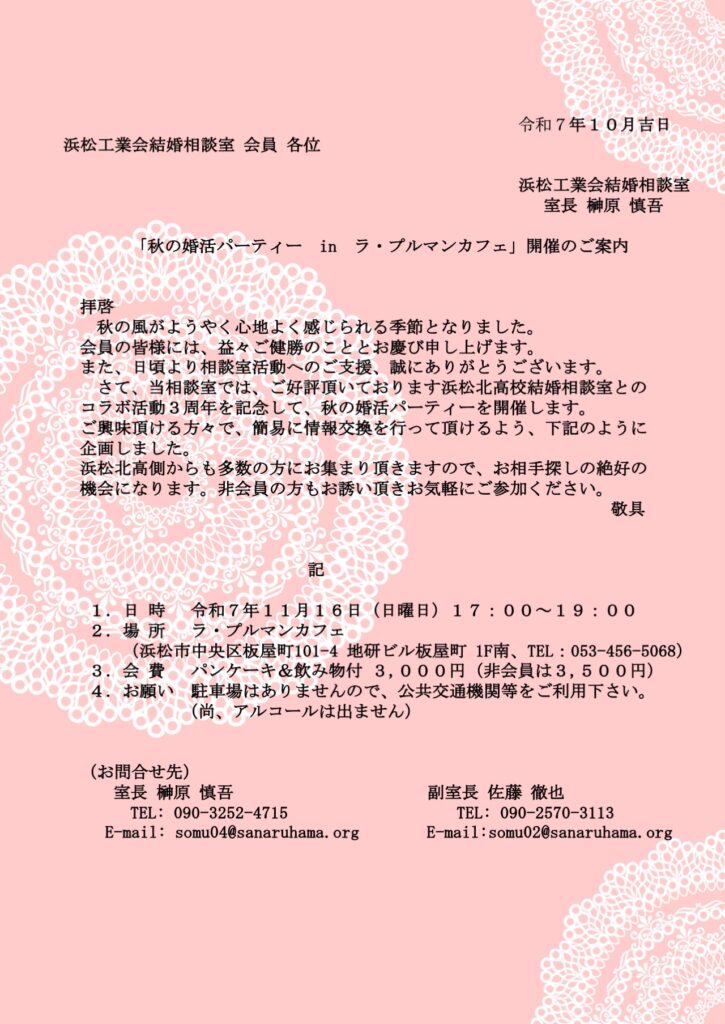 浜松工業会結婚相談室では、浜松北高校結婚相談室とのコラボレーション3周年を記念し、好評をいただいた婚活イベントを今秋も開催いたします!